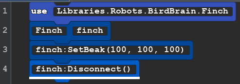 Once you have run this code try changing the integers (SetBeak (0,100,0) makes green. What other colors can you make.